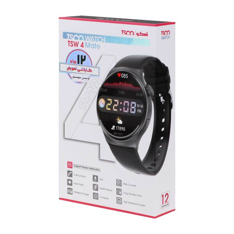 سبک طراحی این ساعت دایره‎ای بوده و به ساعت‌های هوشمند گوشی‌های اندرویدی شباهت زیادی دارد. اما برای گوشی‌های اپل هم قابل استفاده است. با نمایشگر دایره‌ای به ابعاد 1.463 اینچ و از نوع IPS HD واضح‌ترین تصاویر را به شما نمایش خواهد داد. رزولوشن این نمایشگر به 360×360 رسیده و جنس خود ساعت از آلیاژ زینک و IML ساخته شده است. در قسمت بند ساعت 22 میلی‌متری تسکو از متریال سیلیکون استفاده شده تا راحتی حداکثری برای کاربر فراهم شود. همچنین گواهینامه IP67 نیز در آن رعایت شده تا در برابر گرد و خاک و آب به عمق 1 متری به مدت نیم ساعت مقاومت داشته باشد. نوع شارژر آن وایرلس بوده و با ابعاد کلی 44×11 میلی‌متر کاملاً استاندارد روی مچ شما قرار می‌گیرد و برای انواع مچ دست مناسب است. وزن ساعت TSW 4 MATE برابر 33.8 گرم بوده و عملاً وزن آن احساس نمی‌شود. این ساعت زیبای تسکو در سه رنگ جذاب طلایی، نقره‌ای و مشکی به بازار عرضه شده که برای انواع سلیقه‌ها مناسب است. اقلام همراه برای این محصول بند، شارژر وایرلس، دفترچه راهنما و جعبه بوده که می‌توانید از آن‌ها به نحو احسن استفاده کنید. ساعت حرفه‌ای TSCO با قابلیت اتصال به بلوتوث می‌تواند تا ساعت‌ها امور روزانه و زمان شما را مدیریت کند. چیپست استفاده شده در این ساعت از نوع RTL8762DK بوده و برای اینکه ساعت شما کند نباشد و همه فرآیندها را به موقع انجام دهد مناسب است. ورژن بلوتوث این ساعت 5 بوده و اتصال شما بدون قطعی انجام می‌شود. با هر دو سیستم عامل IOS و اندروید می‌توانید به این ساعت متصل شده و لذت ببرید. سنسوری که برای سنجش پارامترهای سلامتی از جمله سطح اکسیژن خون، ضربان قلب، ECG، فشار خون و... در نظر گرفته شده از نوع BD1662 بوده و برای قدم شمار و موارد دیگر سنسور STK8321 وارد عمل می‌شود. قابلیت کنترل موسیقی و دوربین روی این ساعت قرار گرفته و بیش از 150 حالت ورزشی را با استفاده از این ساعت می‌توانید پوشش دهید. با TSW 4 MATE نگران اعلان‌های SMS و فضای مجازی نباشید. همگی را روی این ساعت دریافت خواهید کرد. با توجه به اینکه از زبان فارسی نیز پشتیبانی می‌کند برای افرادی که با زبان انگلیسی راحت نیستند نیز کار کردن با آن راحت خواهد بود. ابزارهای مختلف مانند قطب‌نما، ماشین حساب و ... را روی این ساعت خواهید داشت.